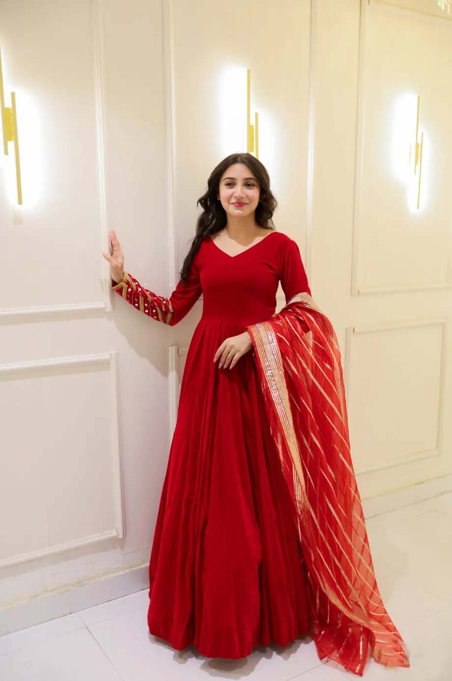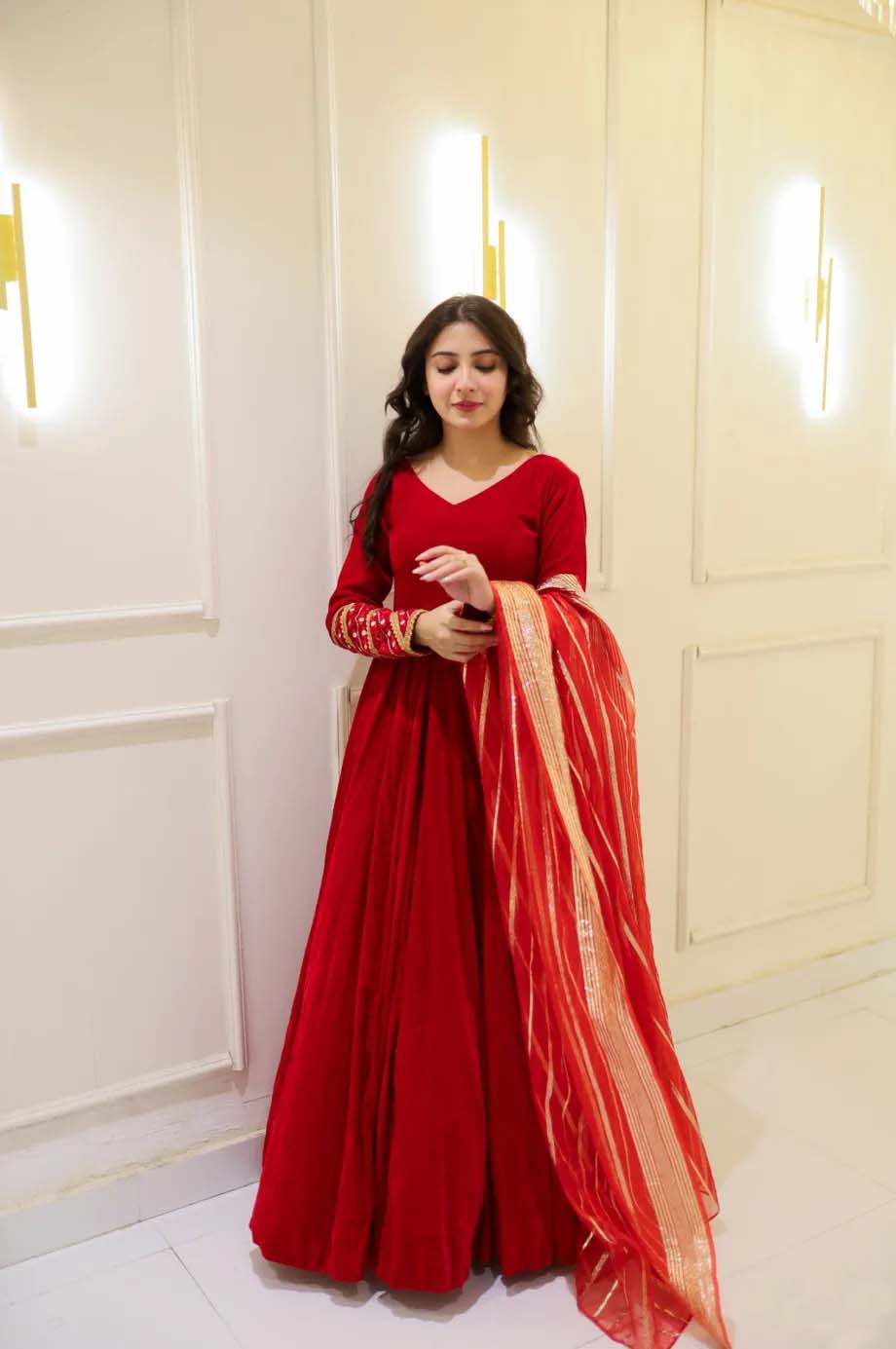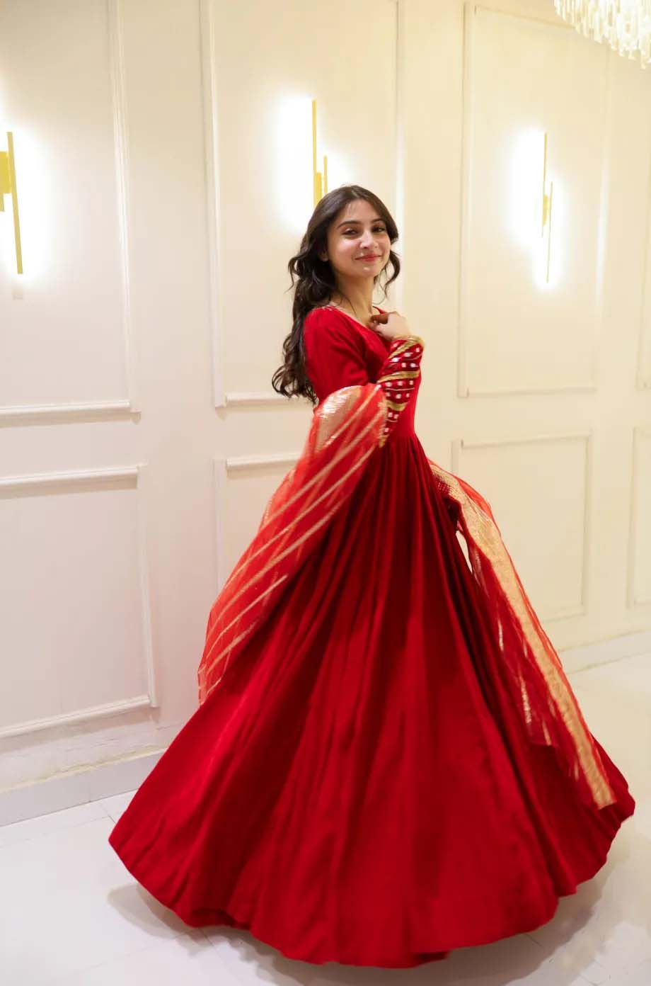 Embrace the drama and richness of tradition with the Scarlet Royal Anarkali Set. This magnificent ensemble features a floor-length gown in a luxurious, deep Scarlet Red fabric, tailored with a flattering V-neckline and a full, voluminous flare that ensures a breathtaking silhouette. The true highlight lies in the intricate gold Zari (or Tilla) embroidery adorning the cuffs, adding a touch of majestic craftsmanship. Completing the look is a vibrant matching Red Dupatta elegantly draped with striking gold striped detailing, providing movement and shine. Perfect for weddings, festive occasions like Eid, or any grand celebration where you want to make an unforgettable statement