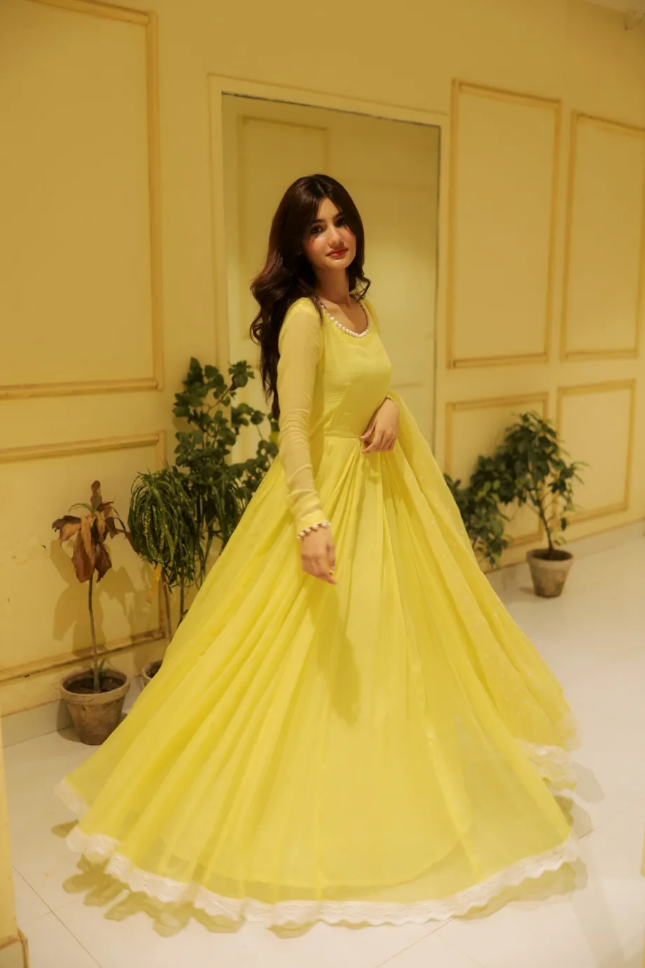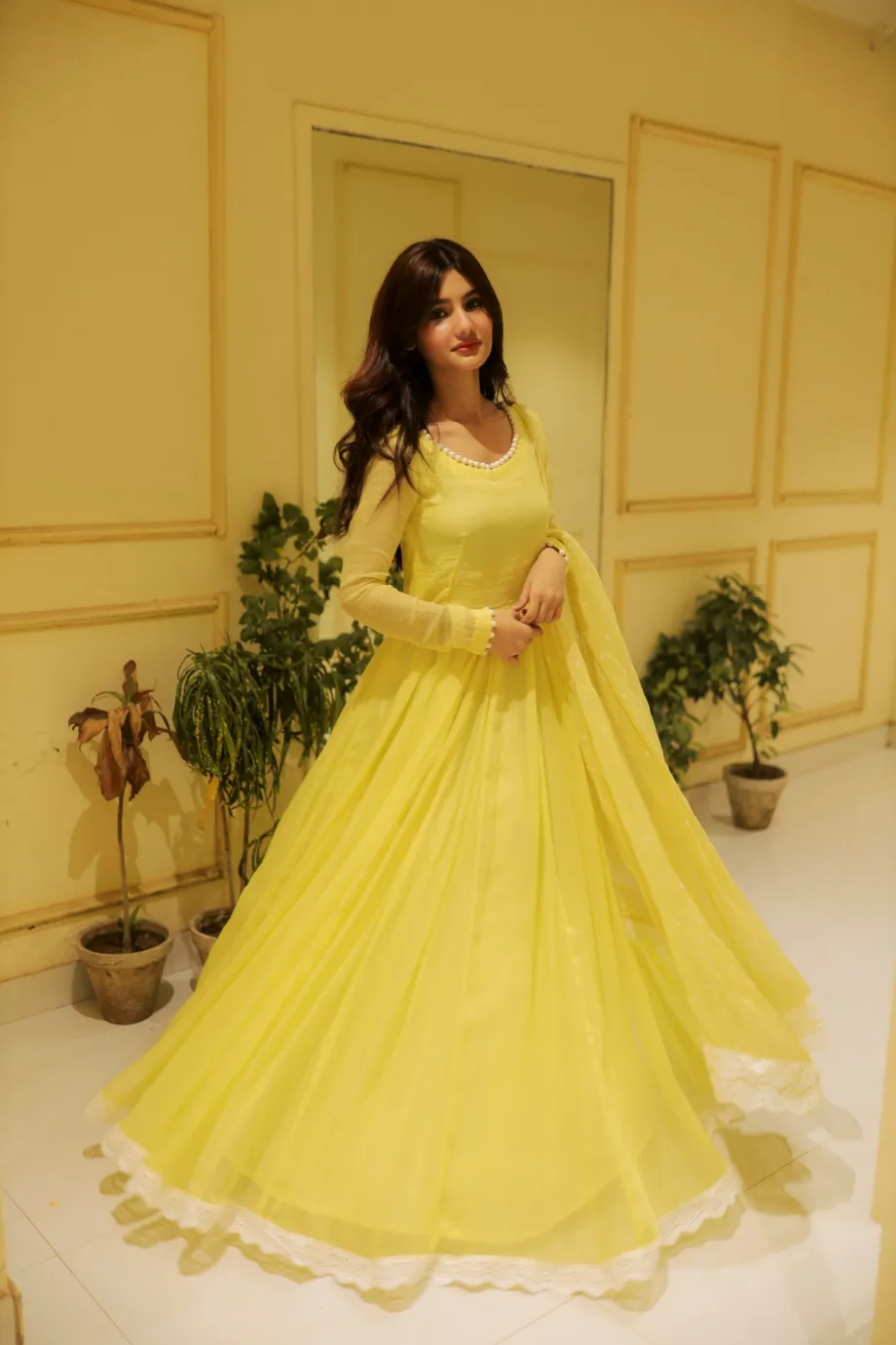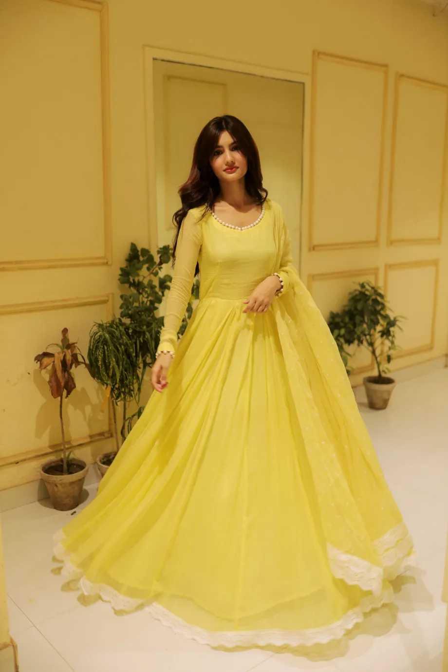 Brighten any occasion with our stunning Marigold Yellow Gown. This vibrant, full-flared dress flows beautifully and features sheer sleeves and an elegant neckline detailed with delicate white pearls. The matching dupatta and white scalloped lace trim along the hem add a touch of charming contrast. It's the perfect statement piece for festive celebrations like Haldi, Mehndi, or any sunny outdoor event.
