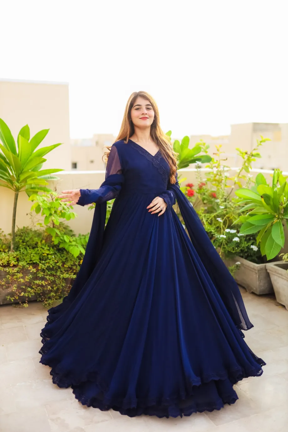 Make a timeless statement in our elegant Midnight Sapphire Gown. This stunning, deep navy blue ensemble features a long, flowing skirt that creates beautiful movement and a flattering V-neckline with delicate embroidered or pleated detailing on the bodice. The dress is complemented by sheer, full sleeves and a matching blue dupatta. Perfect for evening events, formal dinners, or festive occasions, this deep blue gown offers both luxury and sophistication